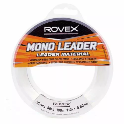Rovex Rovex Mono Leader 100m 0,80mmLager du dine egne tackler til havfiske eller trenger du fortom til pilkefiske? Da er dette materialet du leter etter! Rovex Mono Leader er produsert av state-of-the-art copolymer nylon teknologi for å skape en pålitelig og holdbar sene med et fantastisk styrke/diameter forhold.Det er lett å håndtere og å knyte knuter med.Knutestyrken og strekkstyrken har gjort denne sena svært populær blant seriøse sportsfiskere som krever en tøff sene som kan lande de største fiskene.Rovex Mono Leader er en myk Copolymer nylonsene som er både slitesterk og myk, og som har en enestående knutestyrke. Det er en lett og håndterbar sene, og et meget godt valg ved krevende fiske. Det fungerer utmerket som fortommateriale ved havfiske, gjeddefiske, og sågar ved big game-fiske i tropiske farvann. Bruddstyrke:0,60mm – 18,14kg0,70mm – 27,22kg0,80mm – 36,29kg0,90mm – 45,36kg1,20mm – 68,04kg1,40mm – 90,72kg1,80mm – 181,44kg