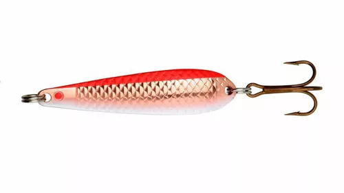 Søvik-Auren 14 g 47 Rød/Kobber/PearlJakten på en ny sjøørretsluk i Søvik-sortimentet ble nokså enkel. Etter en gjennomgang av den gamle skattekisten fra Søvik, falt valget på Søvik Auren. Den spennende slukoverflaten gjorde utslaget, og etter at noen eksemplarer ble re-produsert og testet, var det ingen tvil om at dette var riktig valg. Sluken kan fiskes både hurtig og sakte, og selv når det så vidt er fart på den, beveger Søvik Auren seg veldig fint og forlokkende i vannet. Under lengre spinnstopp på flere sekunder, roterer sluken mens den synker, og skifter synkeretning underveis. Mer kan du ikke be om, spesielt ikke når det er kaldt i vannet og fisken er treg. Søvik Auren leveres i en lang rekke forskjellige, spennende fargekombinasjoner og to vekter, 14g/6cm og 18g/8cm. Slukene er laget med tanke på sjøørret, men fungerer vel så bra til innlandsørret og andre fiskespisere i både ferskvann og saltvann.