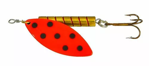 Søvik Laksespinner 28gr Fluo/RødAv og til er spinnere det som skal til for å tirre laksen til hogg, og Søvik laksespinnere kan være det som knekker koden når laksen er vrien. De veier 18 og 28 gram, er kompakte og montert med et langsmalt blad som kommer seg ned gjennom strømmen mot bunnen der laksen står. Leveres med 8 forskjellige mønstre på spinnerbladet. Treblekroken er montert i en solid splittring slik at man i tillegg kan skifte denne.