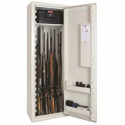 Våpenskap Scandinavian Safe SP8 10 vpnEt stort og romslig våpenskap som passer godt for 8-10 våpen. Med topphylle og ekstra hyller i døren. Leveres med omstillbar sikkerhetslås med 2 nøkler. Skapet er enkelt å forankre i bygningsstrukturen med fire forankringshull i bunn og rygg. FG-godkjent etter norske krav. Høyde: 150cm Bredde: 50cm Dybde: 30cm Volum: 300l Vekt: 130kg